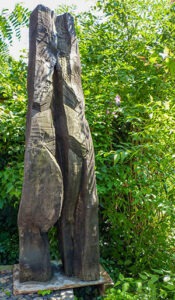 Meine Installation, bestehend aus den drei Eichenholzskulpturen, setzt ein kraftvolles und zugleich behutsames Zeichen für den sorgsamen Umgang mit Holz, das ja mehr ist als „nur ein Material“, es ist immer ein Stück anderen gelebten Lebens. Die zwei aufrechtstehenden Skulpturen entstanden aus einem Eichenstamm. Dieser Baum hatte zu Lebzeiten Erfahrungen, die ihn in enge Beziehungen setzen zu dem, was hier in der Heide ablief. Die dritte Skulptur verweist auf das Grundprinzip des Lebens: Immer wieder aufstehen, immer wieder von vorn beginnen. Sie bildet ein Gleichnis für diese Sukzessionslandschaft.Für alle Skulpturen der Installation nutzte ich beim Erstellen die uralten Techniken des Spaltens und Behauens, was zu einer Erhöhung der Dauerhaftigkeit und Beständigkeit im Witterungsbereich führt.