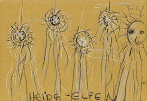 Heidemarie Klaue sieht in den aus der nordischen Mythologie stammenden Naturgeistern nicht nur romantische Fabelwesen. Vielmehr erkennt sie in ihnen Bewohnerinnen mit dem wahrscheinlich ältesten Mietrecht in der Lieberoser Wildnis. Ihre Elfen, die sich, sechs an der Zahl, im Reigen zwischen Birkenstämmen versammeln, sind allerdings keine mit magischen Kräften ausgestattete spitzohrige Wesen und auch keine, aus der Literatur bekannte, geflügelte Kleinwesen. Auch hat sie auf jegliche naturalistische Annäherung verzichtet zugunsten einer naturnahen Stilisierung, die vom geschmückten Kranz als dem Erkennungsmerkmal von tanzenden Elfen inspiriert wurde. Diese Kränze mit einem Durchmesser von etwa 60 cm sind mit verschiedenen, mehrheitlich in der Lieberoser Wildnis gefundenen Naturmaterialien bestückt. An ihren Rändern sind leichte Textilbahnen angebracht, die bei günstigem Windhauch eine in Bewegung geratene figurale Andeutung erzeugen oder fließende Gestaltformen annehmen, die in ihrer Rätselhaftigkeit und in der Gruppe ihren ganz eigenen Zauber entfalten. hs