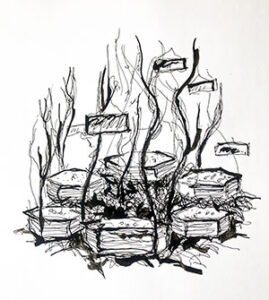 Die geplante Installation besteht aus sechs „Bienentischen“, die in einer annähernd würfelförmigen Anordnung (ca. 3 x 3 x 3 m) aufgestellt werden. Jeder Tisch hat einen Durchmesser von 60–80 cm und eine Höhe von 30–40 cm. Die Tische sind aus Altholz gefertigt und mit alten Brettern, Stöcken, Reisig, Leinen und Erde gestaltet, sodass eine strukturreiche, natürliche Oberfläche entsteht. Darauf wachsen verschiedene bienenfreundliche Pflanzen, die den Wildbienen Nahrung und Lebensraum bieten.