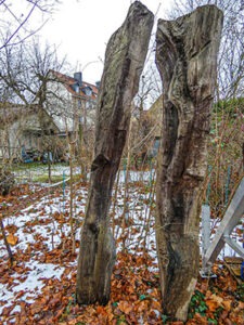 Meine Installation, bestehend aus den drei Eichenholzskulpturen, setzt ein kraftvolles und zugleich behutsames Zeichen für den sorgsamen Umgang mit Holz, das ja mehr ist als „nur ein Material“, es ist immer ein Stück anderen gelebten Lebens. Die zwei aufrechtstehenden Skulpturen entstanden aus einem Eichenstamm. Dieser Baum hatte zu Lebzeiten Erfahrungen, die ihn in enge Beziehungen setzen zu dem, was hier in der Heide ablief. Die dritte Skulptur verweist auf das Grundprinzip des Lebens: Immer wieder aufstehen, immer wieder von vorn beginnen. Sie bildet ein Gleichnis für diese Sukzessionslandschaft.Für alle Skulpturen der Installation nutzte ich beim Erstellen die uralten Techniken des Spaltens und Behauens, was zu einer Erhöhung der Dauerhaftigkeit und Beständigkeit im Witterungsbereich führt.