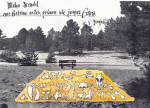 Das „Land von Morgen“ entwickelt und verändert sich auf und mit seinen historischen Schichten, Unter- und Hintergründen. Die Skelettteile werden in einem bestimmten Ordnungsmuster, d.h. horizontal und vertikal ausgerichtet, gereiht; mit Drähten und kleinen Erdnägeln fixiert. Die Fläche wird mit einer Sandschicht (2 – 3 cm) aufgeschüttet und verdichtet, so dass ein glatter Untergrund entsteht. (mb)